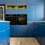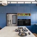 מטבח יוקרתי בגווני כחול עמוק לפי הדרישות, נגיעות של זהב ומשחקי אור במעברים